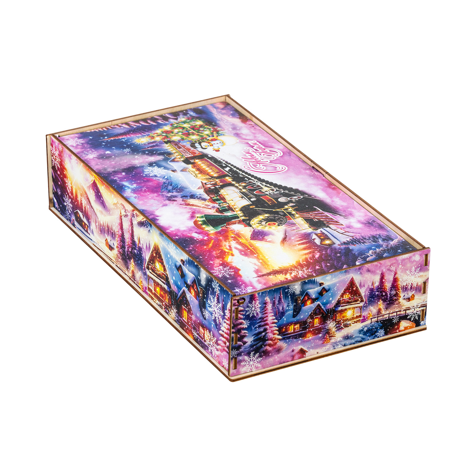 Секрет идеального новогоднего сладкого подарка прост: это яркая привлекательная упаковка и вкусные сладости внутри. “Снежный экспресс” - это подарочный набор, который как раз прекрасно подходит под эти характеристики. Это небольшая деревянная коробчка с очень необычным ярким оформлением. На ней изображен зимний вечер в небольшой деревне, рядом с которой по железной дороге весело мчится праздничный поезд. В этом поезде находятся счастливые люди, которые вот-вот смогут увидеться со своими родными и друзьями и отпраздновать с ними Новый год. В подарочный набор входит килограмм разнообразных сладостей, небольшой памятный сувенир и безграничная радость для всей семьи!